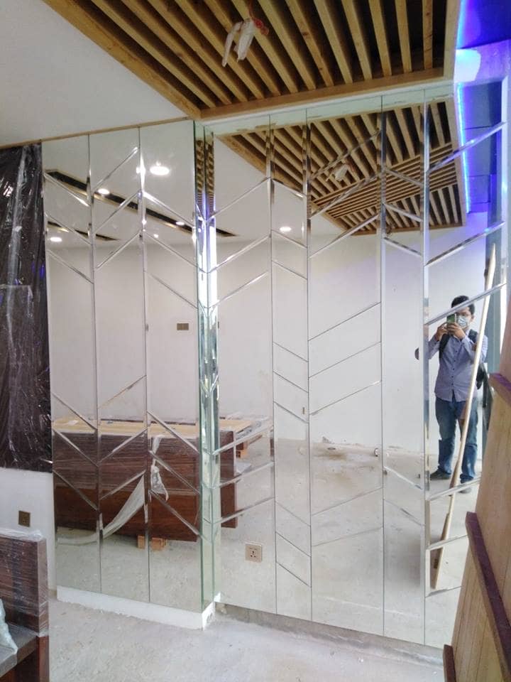 kính Thủy trang trí – Gương ghép tường nghệ thuật được tạo bởi những tấm gương chia nhỏ và mài vát cạnh. Sau đó ghép với nhau theo nhiều kiểu và hình dáng khác nhau tuỳ vào mỗi thiết kế, yêu cầu của khách hàng. Để tạo thành một ô gương lớn tổng thể vừa trang trí cho nội thất vừa tối ưu được công năng sử dụng cho không gian của bạn. Các tấm kính thuỷ thường được ghép với nhau theo hình thù sao cho phù hợp với không gian cần trang trí như quả trám, hình vuông, hình nhữ nhật hay gương ghép hình lục giác.
